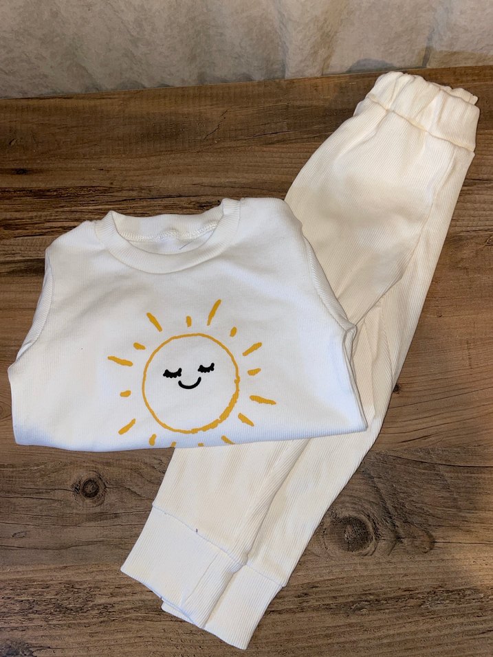Bebek kız için uzun kollu, yuvarlak yakalı, gülen güneş baskılı üst ve uyumlu pantolondan oluşan, yumuşak ve sıcak kumaştan yapılmış açık beyaz renkli takım. ☀️