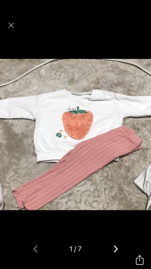 Beyaz uzun kollu üstü baskılı çilek desenli, pastel pembe örgü pantolonlu bebek kız takımı.