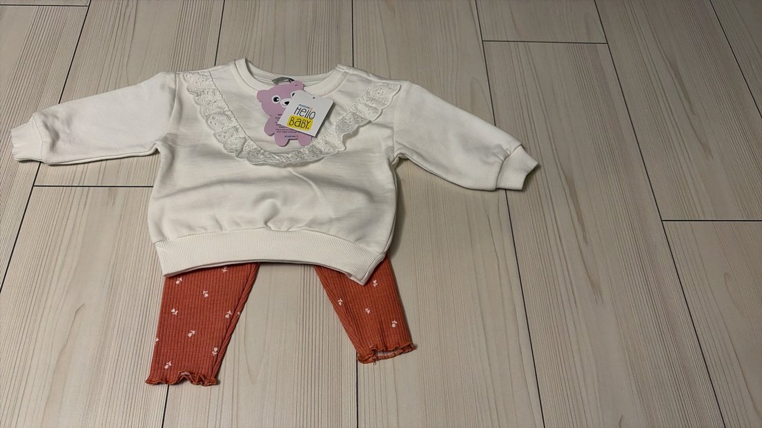 Uzun kollu beyaz örme üst ve pastel renkli desenli pantolonlardan oluşan bebek kız takımı, rahat ve şık bir seçenektir.