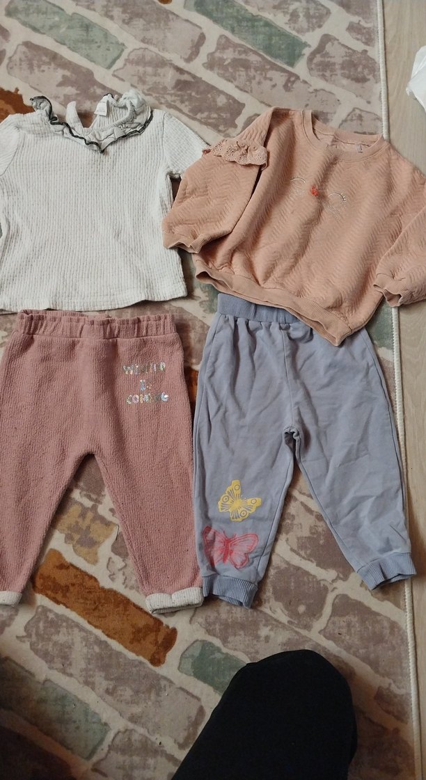 İki pastel renkli bebek kız kombini, uzun kollu ve yumuşak kumaşlı. Beyaz yakalı bluz ve pembe pantolon, pembe dokulu bluz ve kelebekli mavi pantolon içerir.