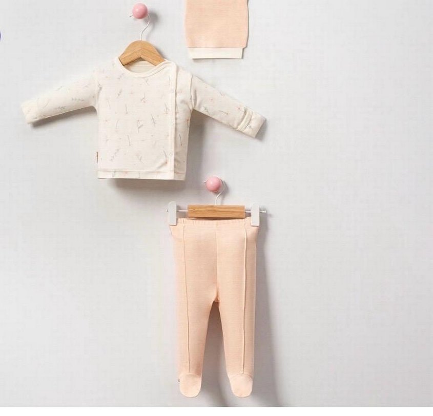 Bebek kız için beyaz uzun kollu üst ve pastel tonlarda ayaklı pantolon içeren şık ve rahat takım.