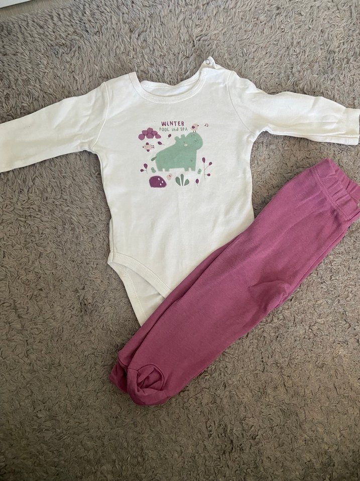 Beyaz uzun kollu baskılı body ve pastel pembe pantolondan oluşan bebek kız takımı, rahat ve şık bir görünüm sunar.