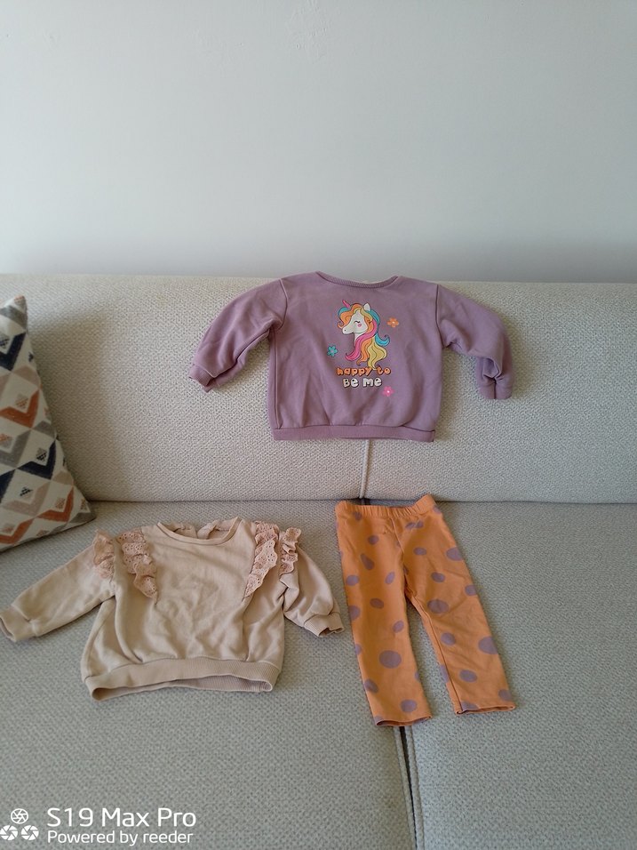 Bebek kız için uzun kollu, pastel tonlarda takım.Ufak tefek geçici leke mevcut çekerken farkettim.12-18 ay.