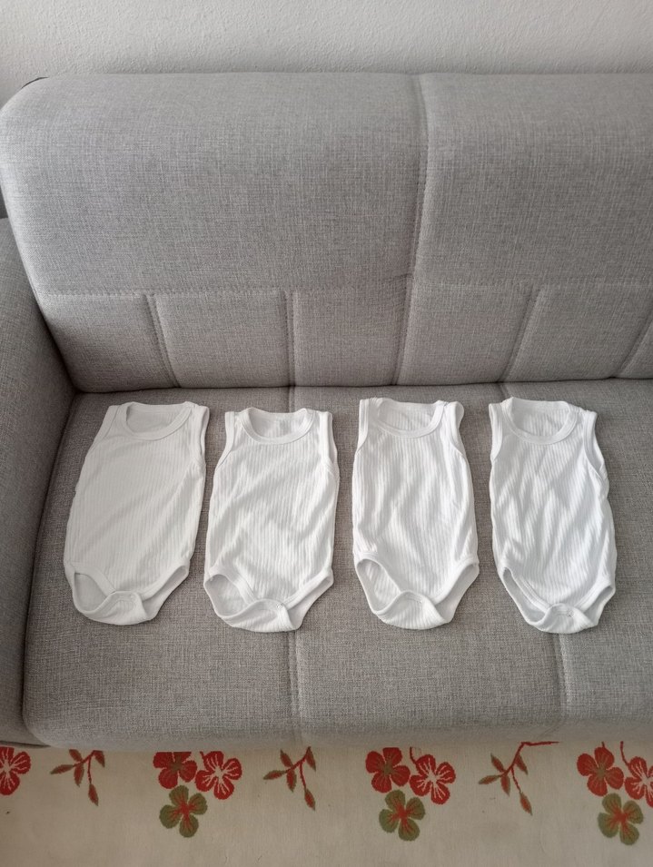 Beyaz kolsuz, yumuşak keten kumaştan yapılmış, bisiklet yaka tasarımlı bebek body. Rahat ve sade stil sunar. 3-6 ay.