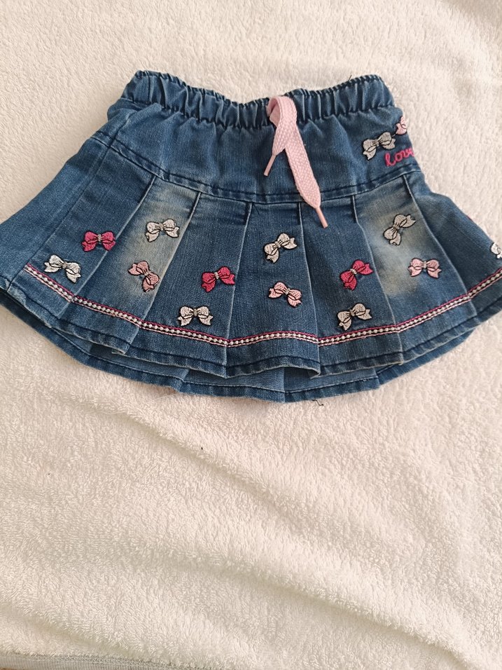 Renkli nakışlı fiyonklar ve fırfırlı etek ucu olan kot etek. Bol kesim, lastikli bel ve pembe bağcıkla rahat ve şık görünüyor.