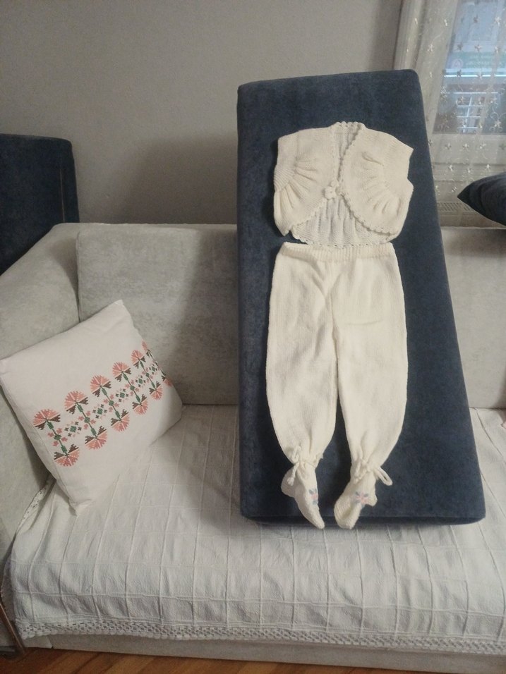 şiş örgü kolsuz yelek ve patikli pantolondan oluşan krem rengi bebek yelek ve patikli pantolon takım . hepsinin fiyatı !.. tek olarak satılır ürün birleştirme yapmayınız !...