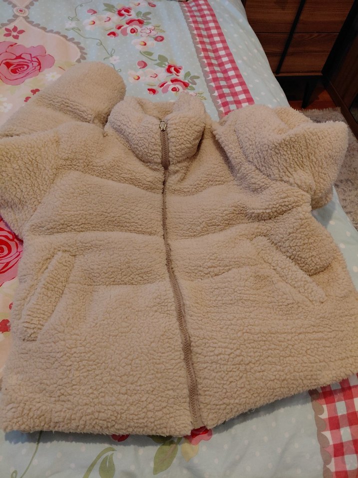 Yumuşak polar kumaştan, kürklü detaylı krem rengi uzun kollu, günlük kullanım için uygundur. 85 kiloya kadar oluyo bende burdan aldim