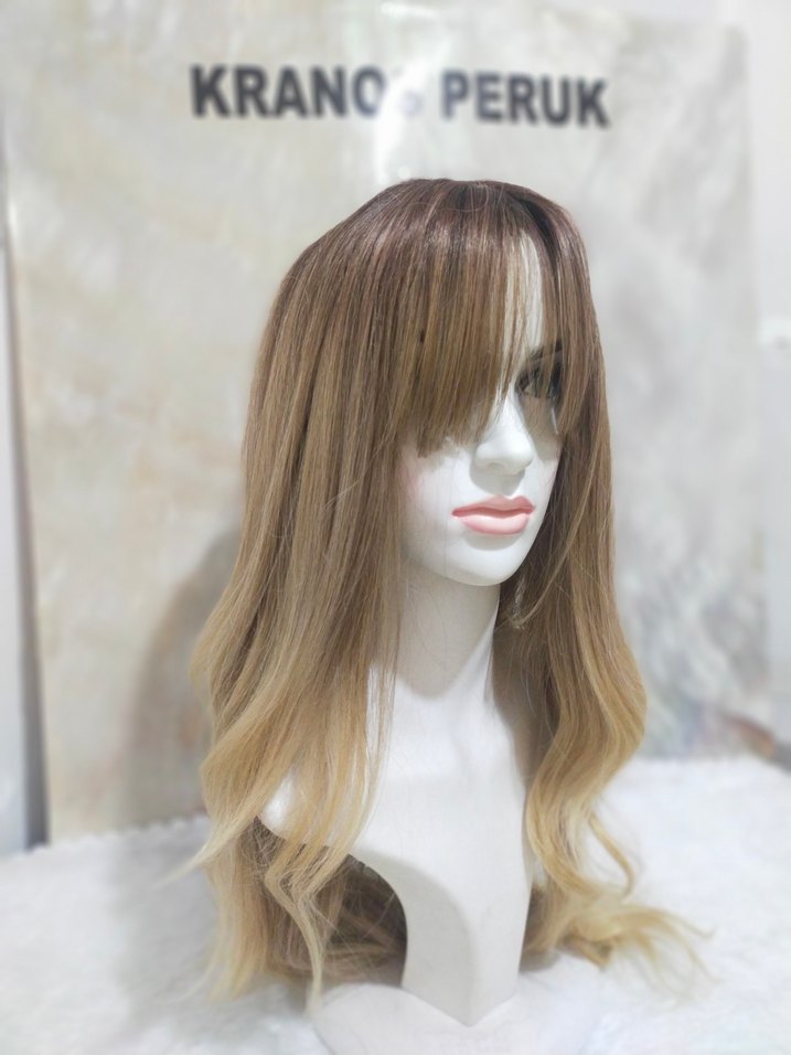 bebek kumralı küllü sarı balyajlı renkli, dalgalı sentetik peruk. Minimalist ve retro tarzlara uygun, bohem ve rahat şıklık sunar. düzleştirici maşa kullanılabilir parlama yapmaz