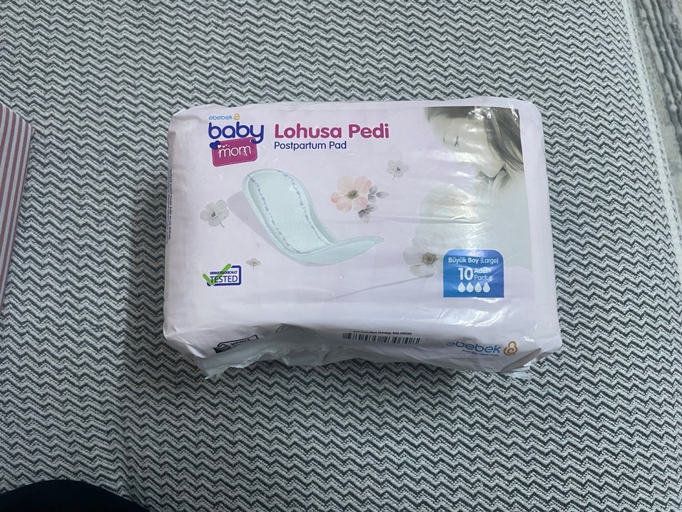 Lohusa Pedi, pastel beyaz renkte, lohusa dönemi için 10'lu paket halinde ve test edilmiştir.