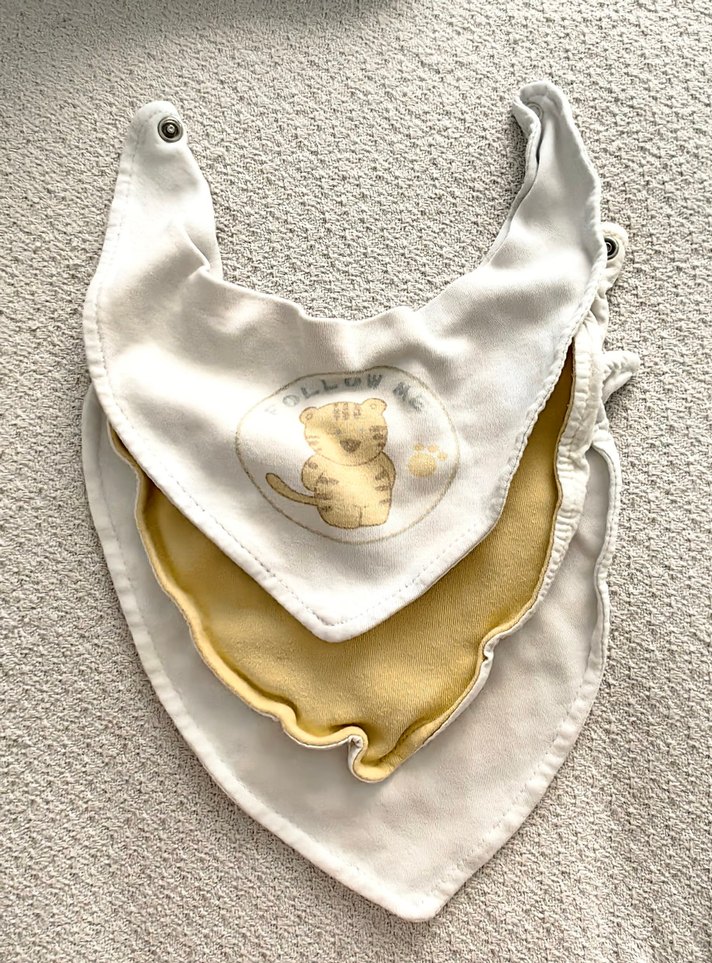 Nakışlı kaplan desenli beyaz bebek önlüğü, yumuşak pastel tonlarda ve kolay kullanım için çıtçıtlıdır.