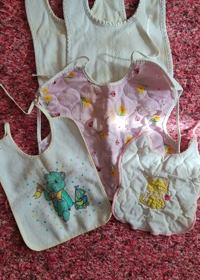 bebek mama önlüğü. sağlam öndeki 3 temiz lekesiz , 2sinden lekeleri çıkmıyor kaliteli pamuklu.