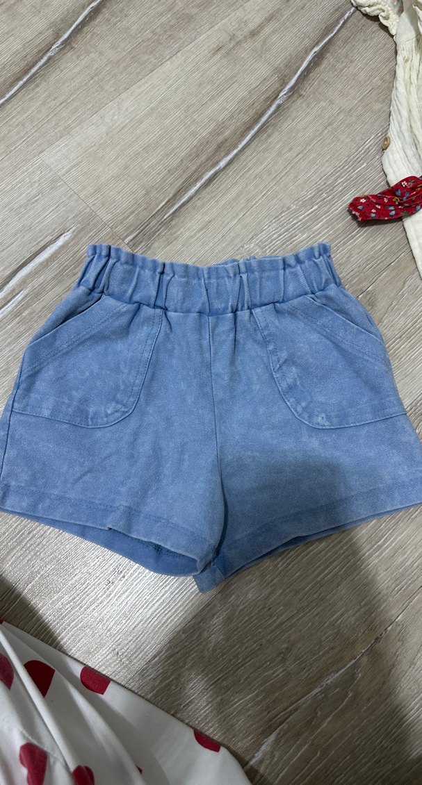 Pastel mavi renkte, bol kesim kısa kadın denim şort. Rahat sokak stili ve günlük dış mekan kullanımı için uygundur. 9-12 fakat 12-18 de uyar
