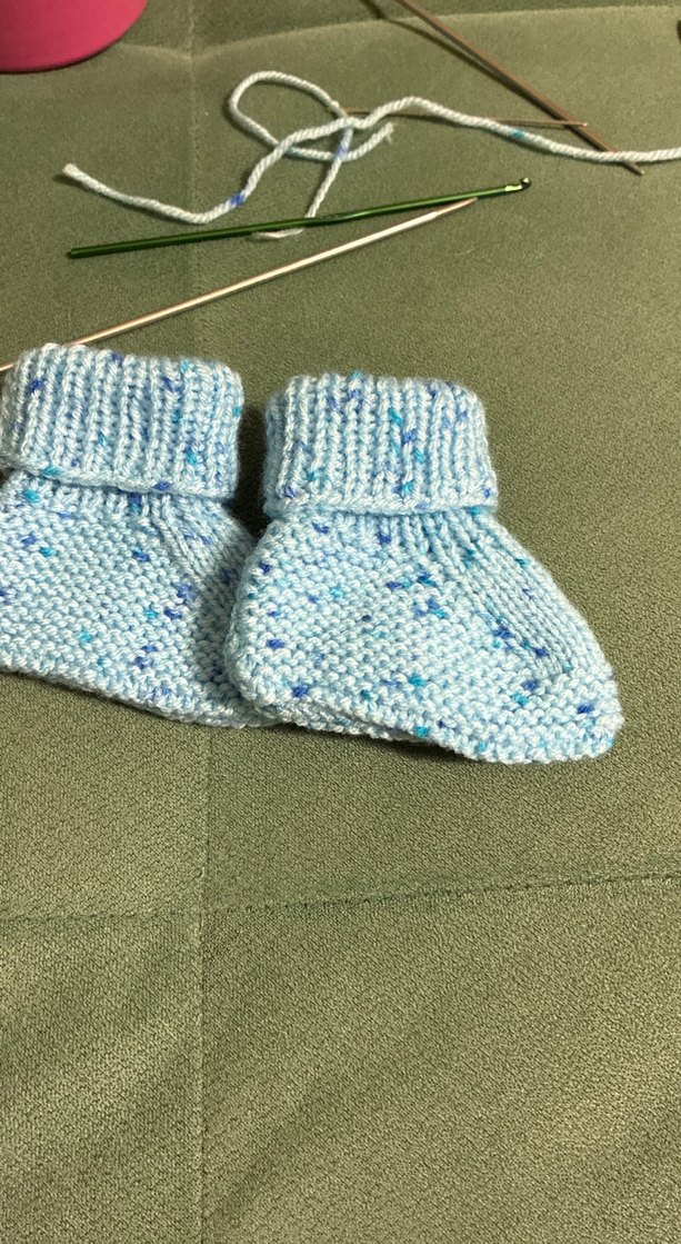 bebekler için mavi renkli, örgüden yapılmış basit ve renkli patikler. Katlanabilir manşeti ile rahat ve sıcacık.taban ölçüsü 7 buçuk 8 santim arası yeni doğan