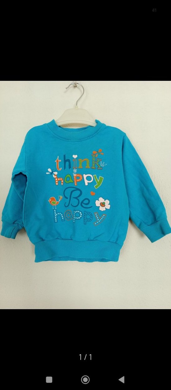 Bebek sweatshirtü, "think happy Be happy" yazılı renkli baskıya sahiptir. Yuvarlak yaka, uzun kollu ve bol kesimdir. Yumuşak ve sıcak kumaştan, örgü detaylıdır.