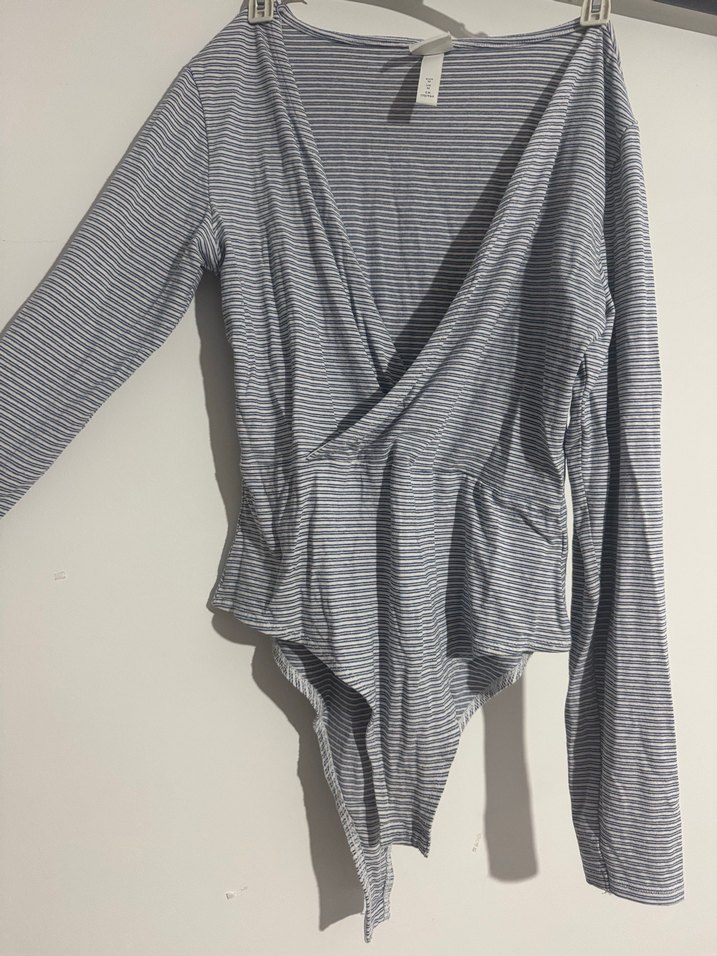 Mavi çizgili, yumuşak keten kumaştan yapılmış, V yakalı ve drapeli önü olan, uzun kollu, midi uzunlukta jeanlerle harika görünecektir☺️