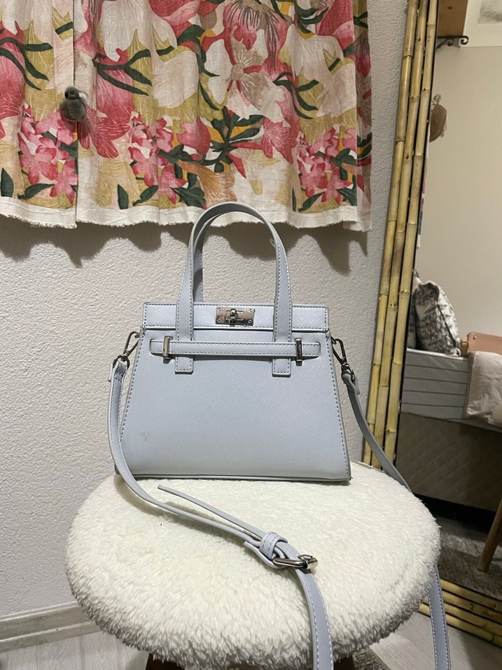 Bebek mavisi deri kadın çanta, tokalı detaylarla modern klasik tarzda, günlük kullanıma uygun. Kulplu ve çıkarılabilir askılı, desensiz yüzeye sahip şık Paris esintisi.