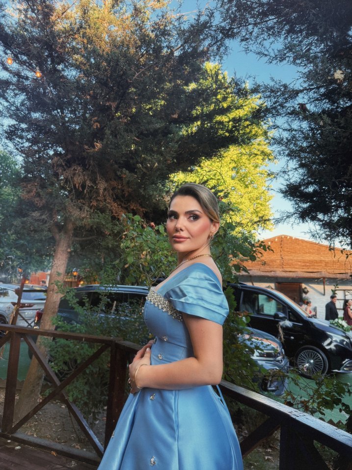 Mavi, drapeli ve etnik desenli, kısa kollu, uzun ve fitted kesim kadın abiye elbise. Yaka tipi kayık yakadır. Düğün için uygundur. Nişanımda kullandım daha yeni aldım 1 haftalık✨