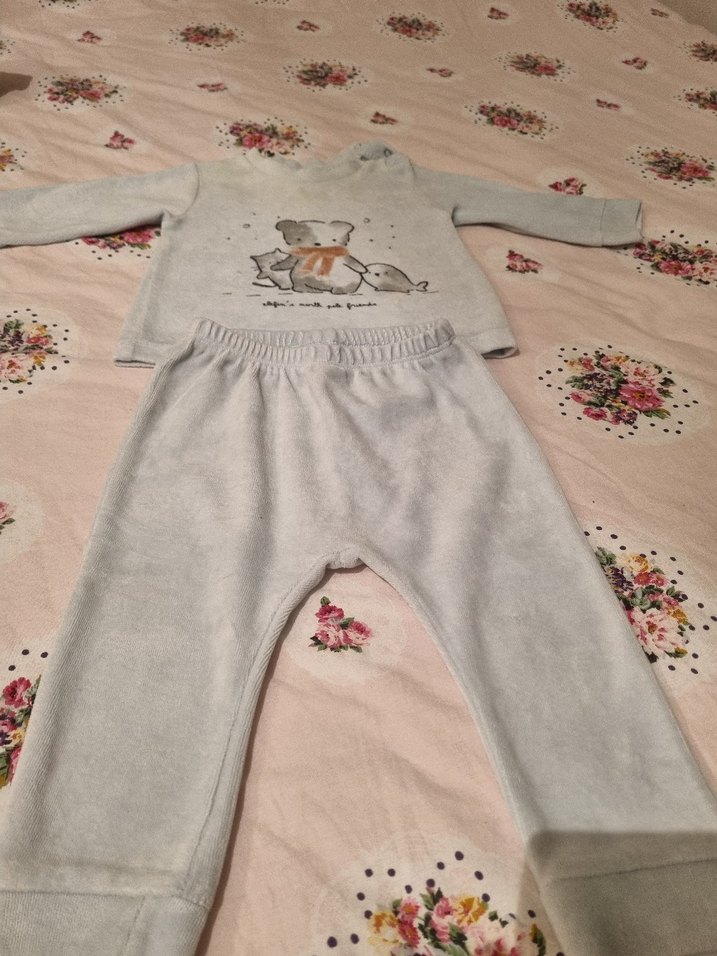 Uzun kollu, triko detaylı ve baskılı üst ile eşleşen pantolondan oluşan yumuşak ve sıcak kumaş bebek erkek takımı. Hiç bir deformesi yok. Çok az giyildi 3 kere en fazla. 9 / 12 ay , 80 cm