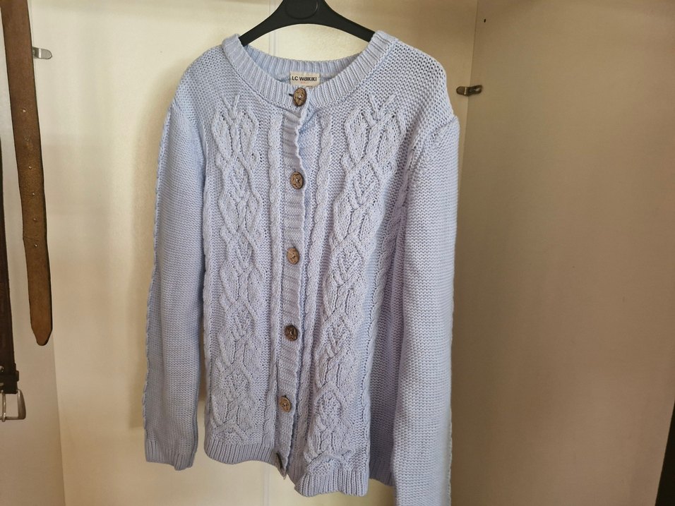 Gri renkli, örgü kumaştan yapılmış, uzun kollu ve yuvarlak yakalı hırka. Orta uzunlukta, sade ve düğmeli tasarıma sahiptir. Rahat ve günlük kullanım için uygundur.
