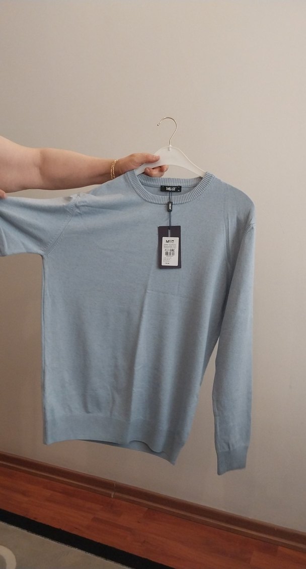 bebek mavisi pamuklu kumaştan, bisiklet yaka ve uzun kollu erkek kazak, rahat ve bol kesimle günlük sokak stiline uygun.