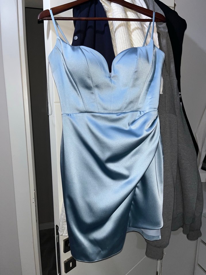 Mavi renkte, ince askılı ve bele oturan büzüşme detayına sahip bu kadın elbise, vücuda oturan kesimi ve midi boyuyla partiler,davetler ve mezuniyetler için uygundur. Yazın bir geceliğine giymiştim mezuniyetimde, sonrasında hiç giymedim,özel dikimdir.