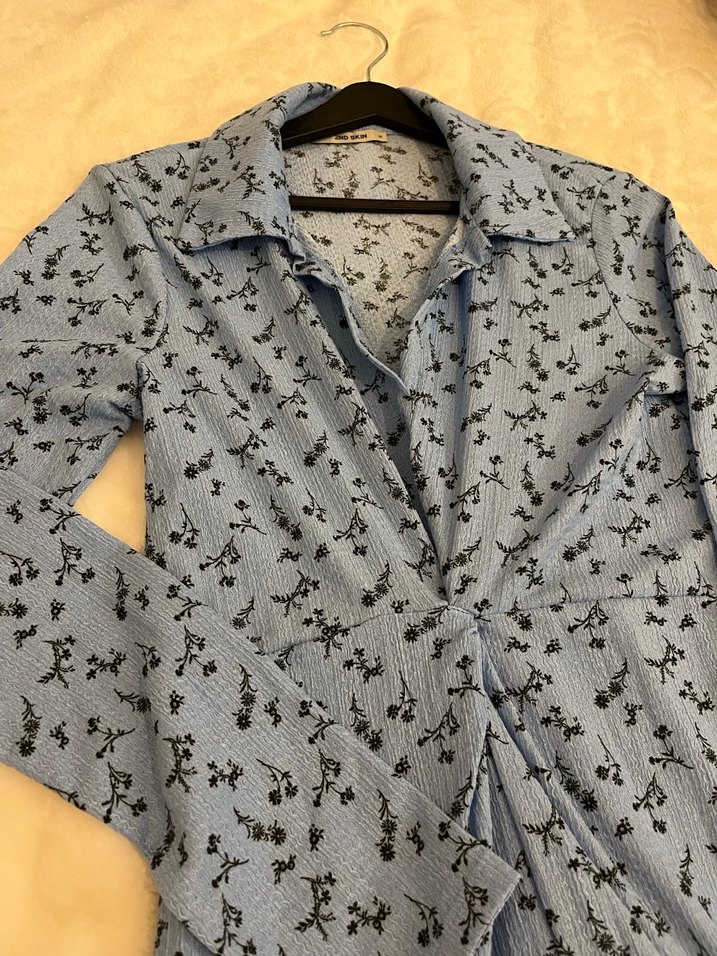 Bebek mavisi siyah minik çiçek detaylı gömlek elbise
