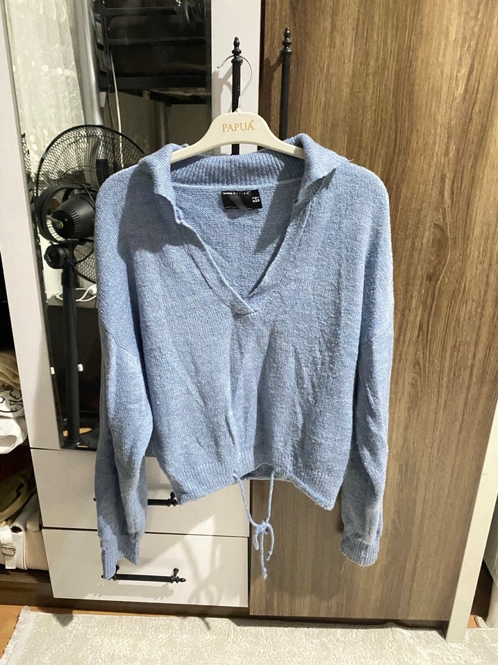 Bebek mavisi renkli, V yaka ve uzun kollu, bol kesim örgü kadın kazak. Midi boy ve sade tasarımıyla rahat ve şık bir günlük kombin parçası.marka temsili değildir
