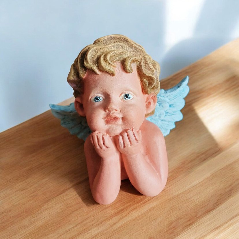 Mavi kanatlı, ellerini çenesine dayamış bej renkli, pastel tonlarda melek figürin. Ayrıntılı yüz ve kıvırcık saçlara sahip. 11*15 cm polyester tasarım üründür.