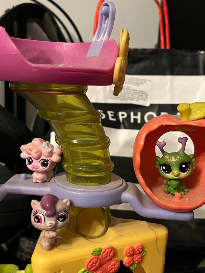 Pastel pembe tonlarında, sevimli tasarımlı aksiyon figürleri seti. Küçük yeşil uzaylı ve hayvan figürleri renkli bir oyun yapısında yer alıyor.