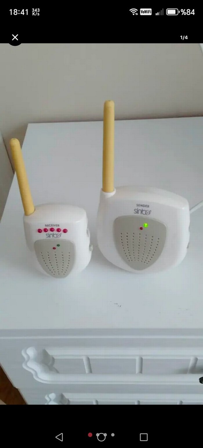 Gönderici ve alıcı birimlere sahip beyaz bebek monitörü seti, iletişim için anten ve gösterge ışıkları içerir. Bebeğimiz büyüdüğü için artık ihtiyacımız olmadığından satıyoruz. Herhangi bir sorun yoktur. Harekete duyarlıdır.