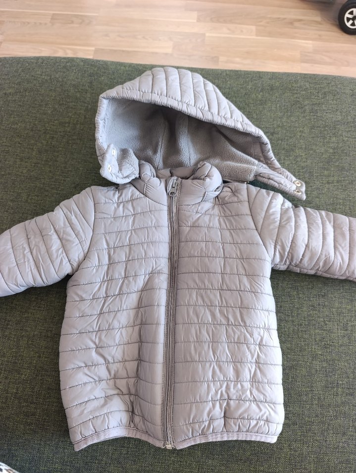 Gri renkte, kapüşonlu ve fermuarlı, yumuşak ve sıcak kumaştan yapılmış, midi boy, dar mont. Uzun kollu, rahat ve basic sokak tarzı.