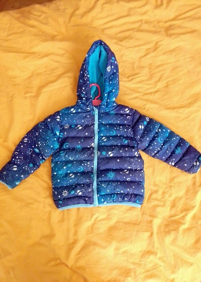 Temiz, içi polar çok sıcak tutan kapuşonlu. 2 yaş ama biz 3 yaşa kadar kullanmıştık. Herhangi bir kusuru yok. Etiketini ensesine geldiği için kesmisim muhtemelen, o yüzden markasını hatırlayamıyorum ama ortalama bir üründü.