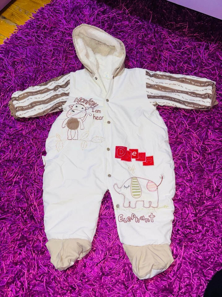 Bebek kız tulumu, kürklü kapüşon ve renkli nakışlı hayvan desenlerine sahiptir. Askısız tasarımlı, bej ayak kapaklıdır. ❄️