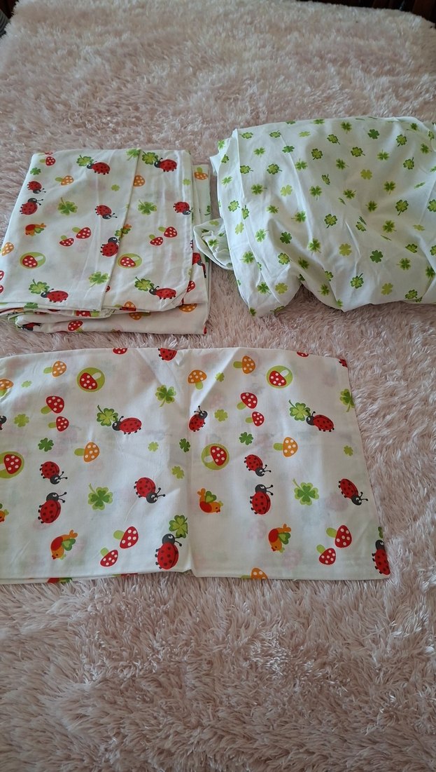 Yumuşak sentetik kumaştan, uğur böceği ve yonca baskılı renkli çocuk uyku tekstili seti. bebek nevresim seti english home markalı sıfır hiç kullanılmadı poşettn çıktı sadece