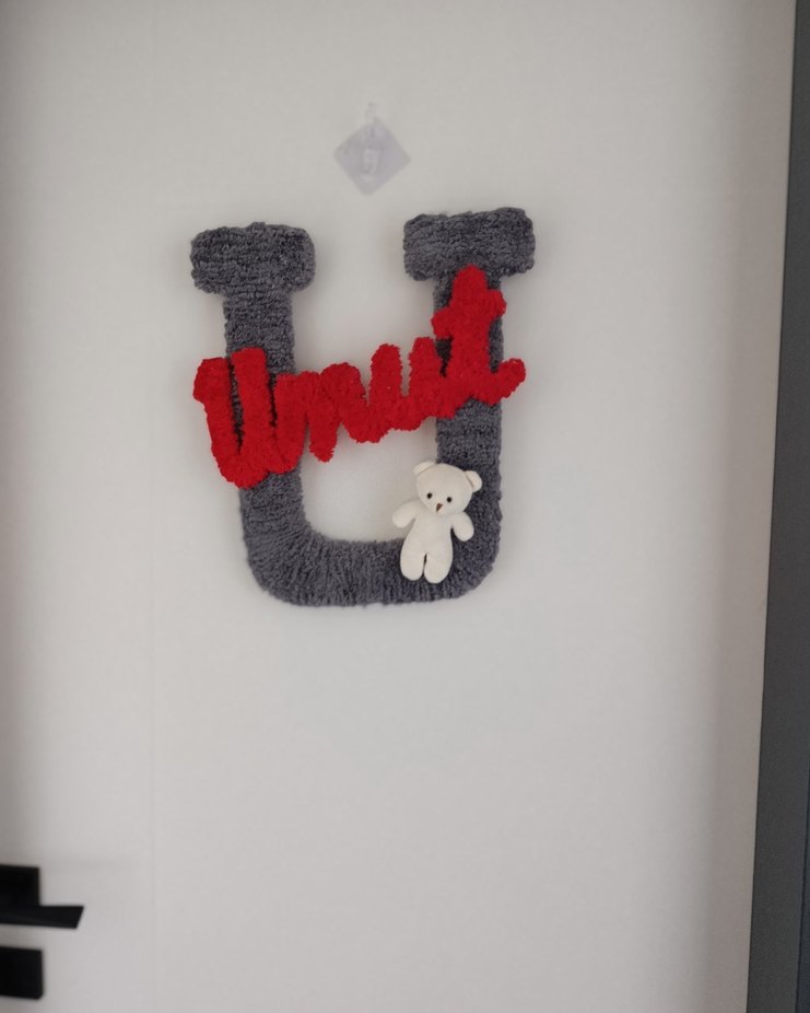 Yumuşak gri peluş U harfi kapı süsü, kırmızı "Unut" yazısı ve küçük beyaz ayıcık ile birlikte. Tamamen el emeğidir. Sıfır üründür. İsteğe bağlı renk ve modelde yapılır. İstenilen isim yazılır. Marka temsilidir.