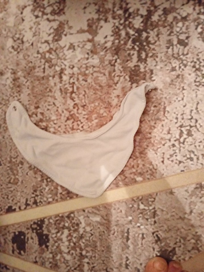 Pastel bej renkte, desensiz ve yumuşak kumaştan yapılmış bebek önlüğü.