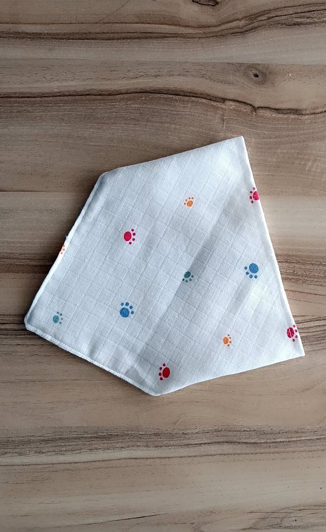 Yumuşak kumaştan yapılmış, renkli pati baskılı beyaz bebek önlüğü. Hafif ve temizlemesi kolay. müslin kumaş isteğe bağlı farklı renkler de dikilir
