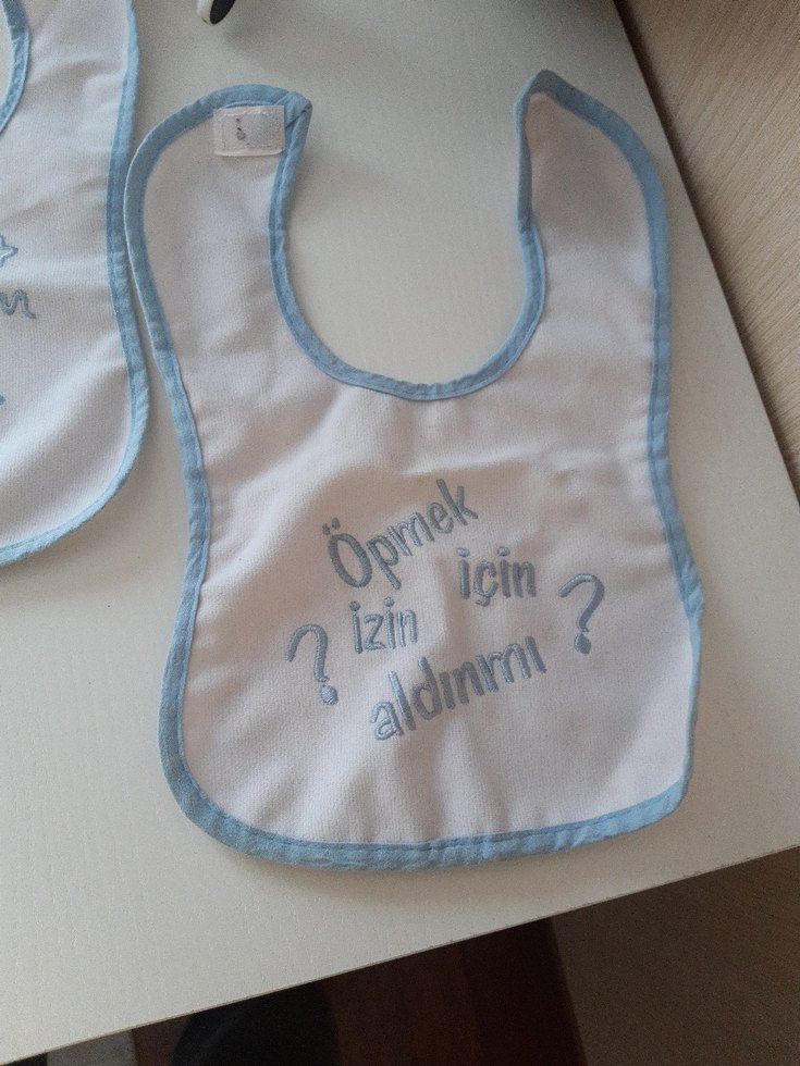 Yumuşak kumaştan yapılmış, gri baskılı "Örnek izin aldın mı?" yazılı mavi bebek önlüğü.