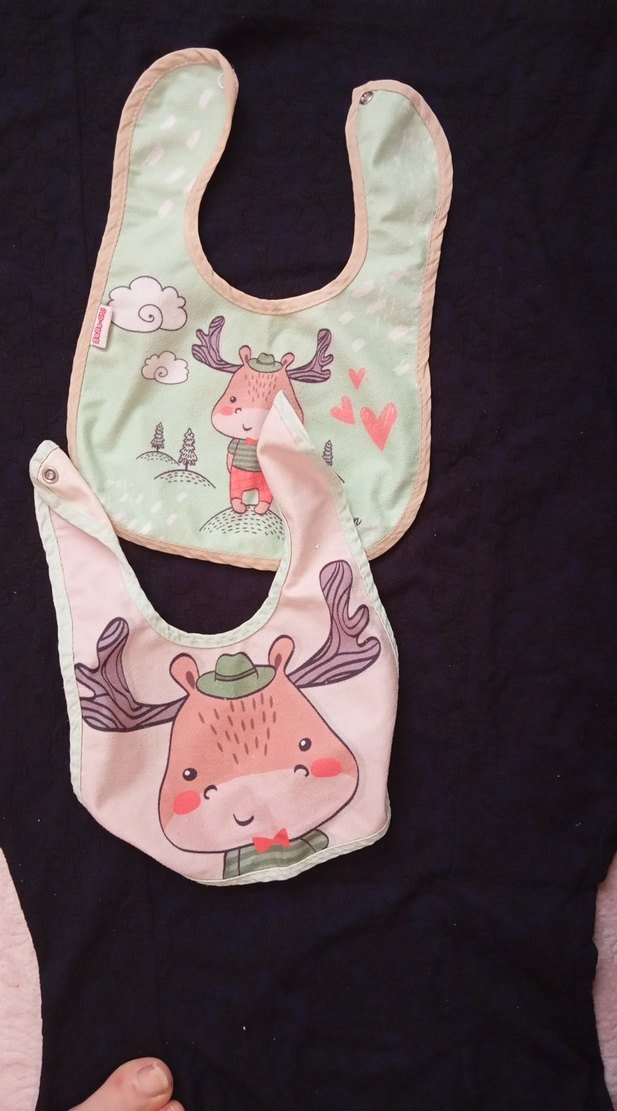 İki adet pastel tonlarda, baskılı geyik figürlü bebek önlüğü. Cırt cırtlı kapanış ve yumuşak kumaş içerir. leke tutmaz kumaş