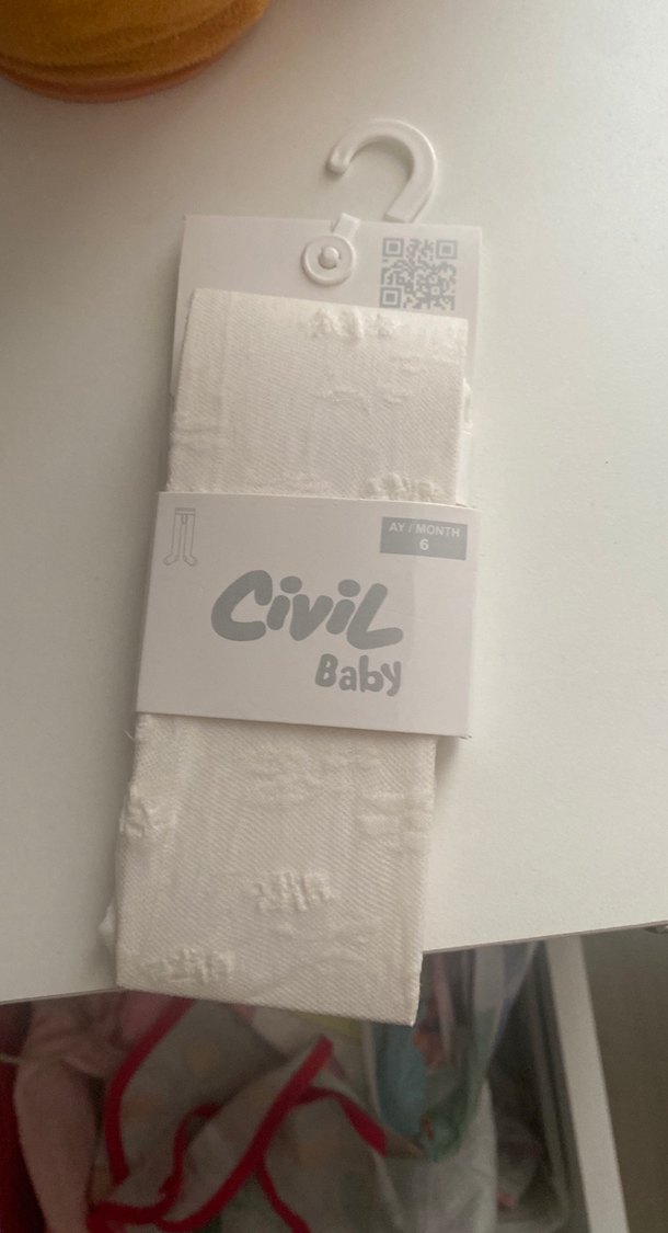Bebekler için Civil markalı beyaz ve gri baskılı önlük. Yumuşak kumaştan üretilmiştir.