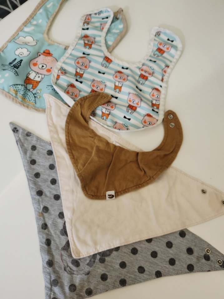 Baskılı ve puantiyeli desenlere sahip, kahverengi ve gri renklerde bebek önlükleri. Kolay kullanım için çıtçıtlı kapama sistemi bulunur.