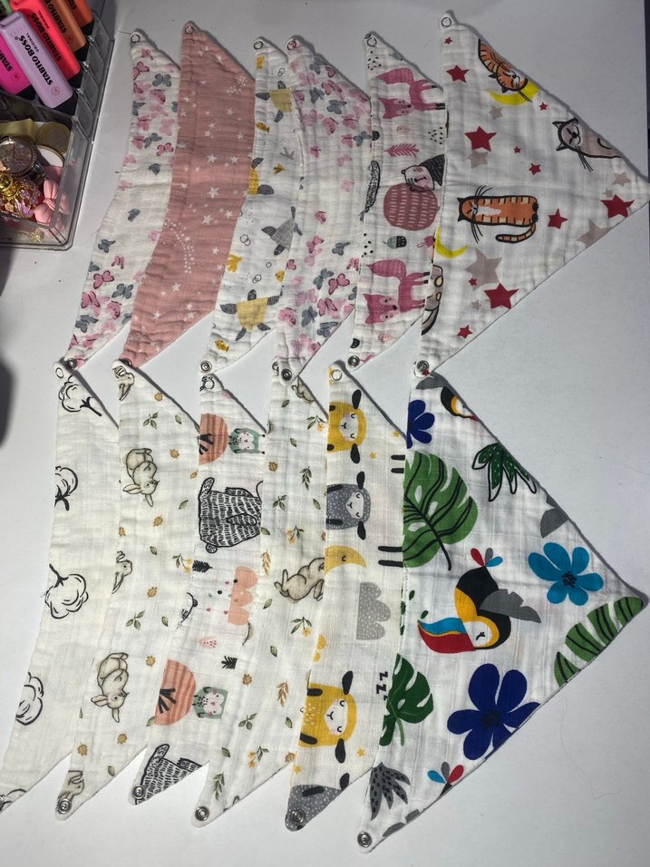 Yumuşak kumaştan yapılmış, çeşitli renkli desenlere sahip üçgen şekilli bebek önlükleri. Kolay kullanım için çıtçıt düğmeli. Müslin kumaş 12li yakalık set