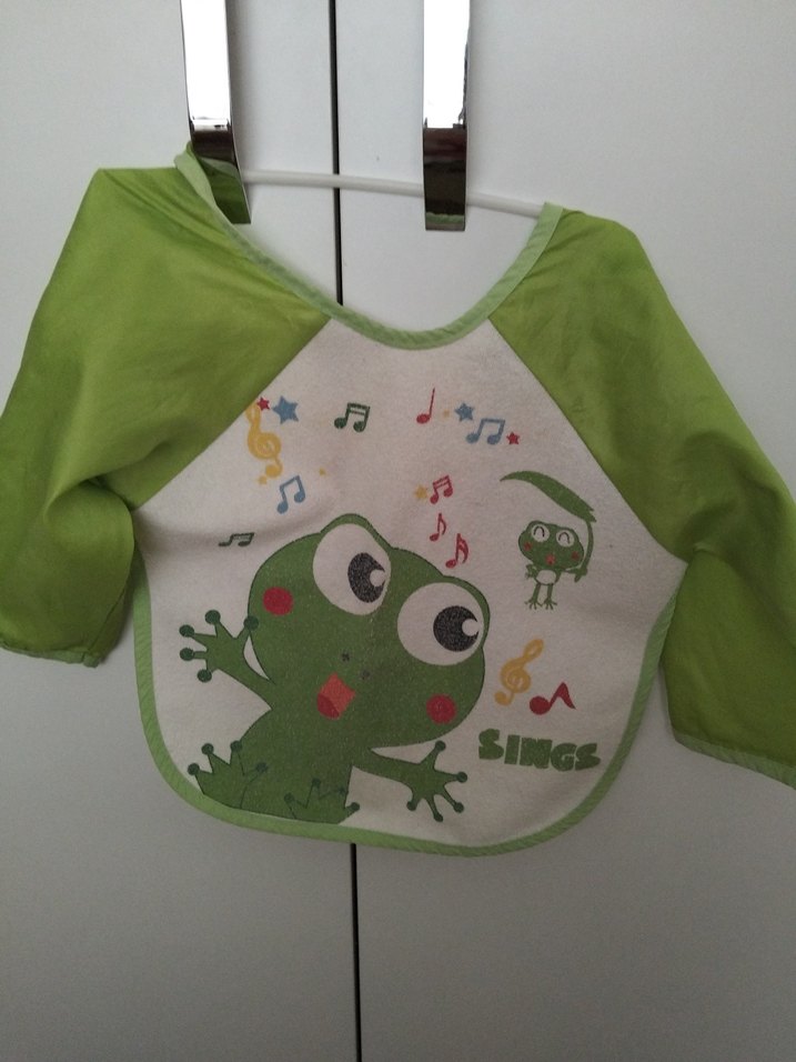 Uzun kollu, yumuşak kumaştan yapılmış, renkli kurbağa ve müzik notaları baskılı bebek önlüğü.