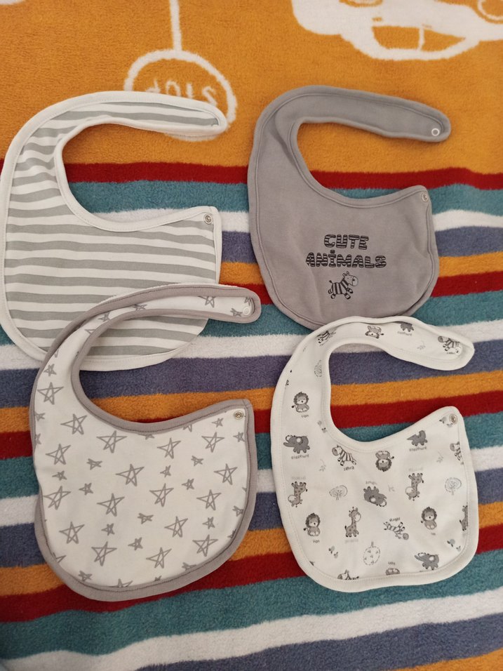 Gri ve beyaz renklerde, yıldız ve hayvan desenli 4'lü bebek önlüğü seti. Bir önlük üzerinde 'CUTE ANIMALS' yazısı bulunur. Yumuşak kumaştan üretilmiştir.