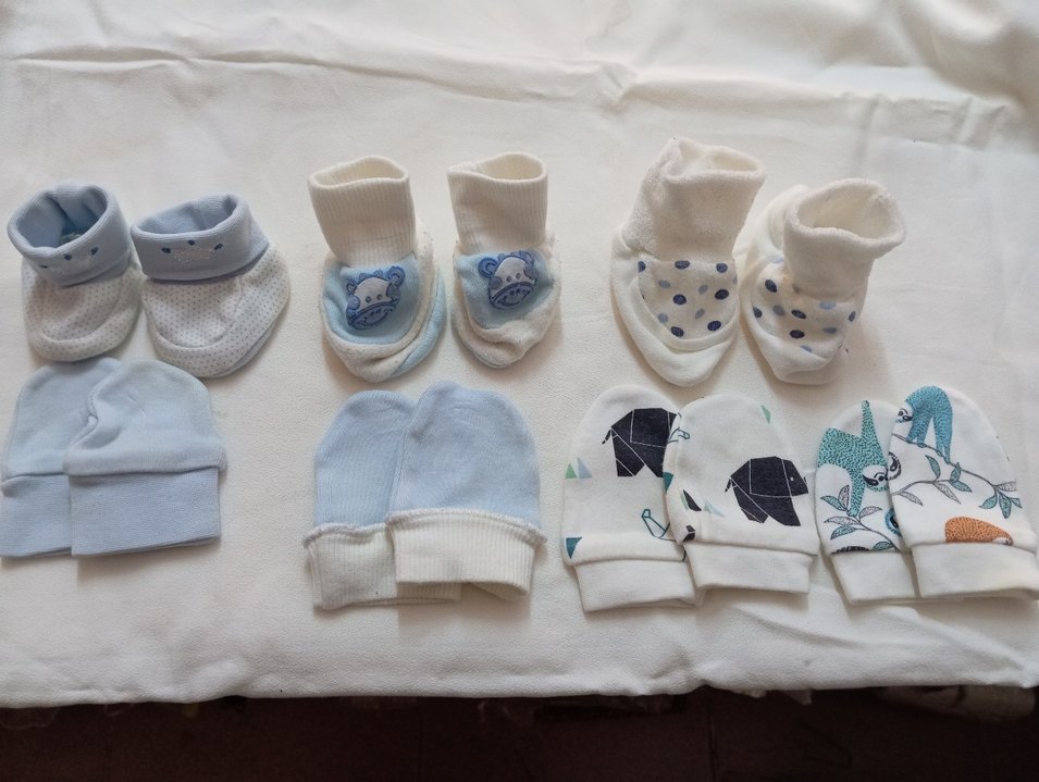 Nakışlı detaylara sahip beyaz örgü bebek botları. Yumuşak ve rahat, günlük kullanım için uygundur. ve eldivenler 7 parça yeni doğan