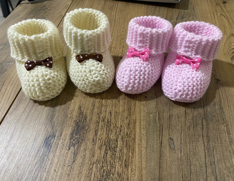 Beyaz ve pembe renklerde, küçük fiyonk detaylı, yumuşak örgü bebek patikleri. Düz ve sade tasarımlıdır.