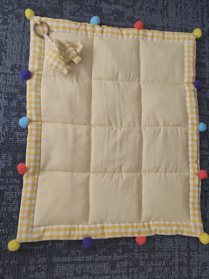 Kareli sarı kenarlıklı, renkli ponponlarla süslenmiş bebek oyun minderi. Küçük fil oyuncaklı, yüzde yüz pamuk duck kumaştan üretilmiştir.içi elyaf dolguludur.üzerinde çıkarılabilir fil oyuncağı mevcuttur.80*100 ölçülerinde üretilmiştir.alt açma için ve yorgan olarakta kullanılabilir.