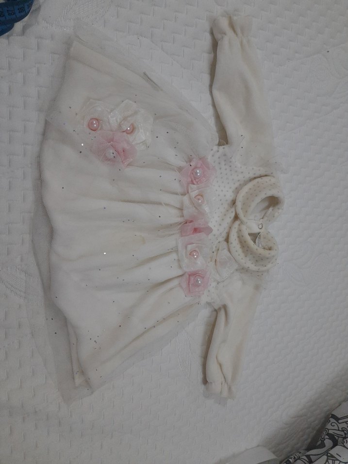 Kız çocuk beyaz, uzun kollu, yumuşak ve sıcak kumaştan yapılmış bol kesim elbise. Yuvarlak yakalı, nakışlı ve fırfırlı detaylarıyla bohem tarzda.