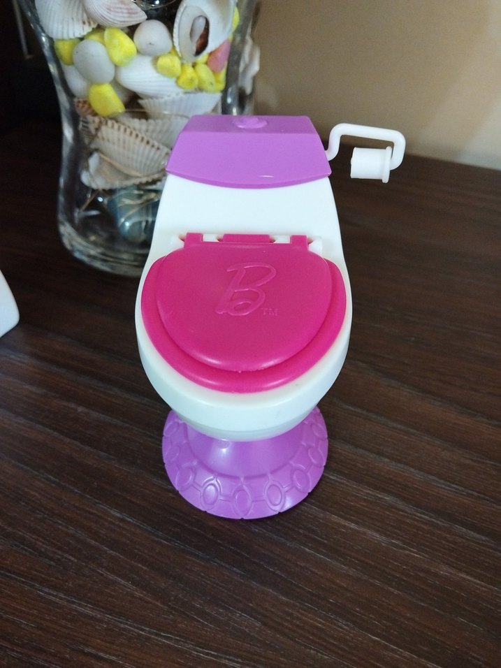Pembe kapaklı ve mor tabanlı küçük oyuncak tuvalet. Yanında tuvalet kağıdı tutacağı bulunur. Bebek hijyen oyunları için uygundur.