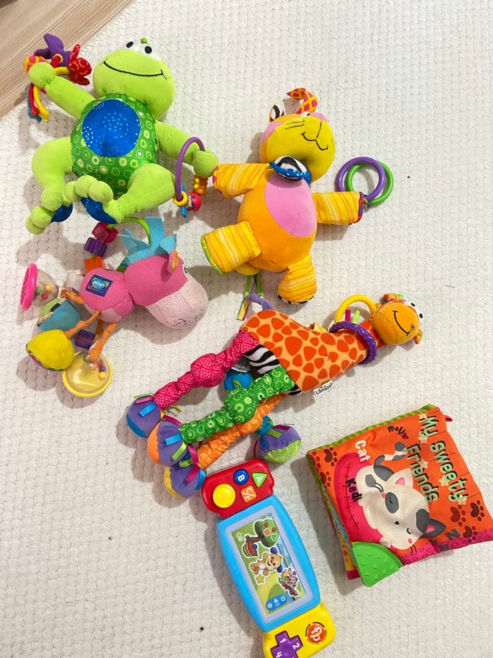 Kızım buyudugu icin artk oynamiyor hepsi de markalidir 3 adet Lamaze marka oyuncak (kalitesni ve fiyatlarni bilen bilir) turuncu ayi figurlu olanin kuyrugunu cekince titriyor bir adet fisher price muzikli egitici kumanda sdce pili bitti pil koyarsaniz aylarca calisir bir adet egitici kitap bir adette playgro marka pembe ufak zurafa hepsi temiz sorunsuz (Tek Tekte Satilir)